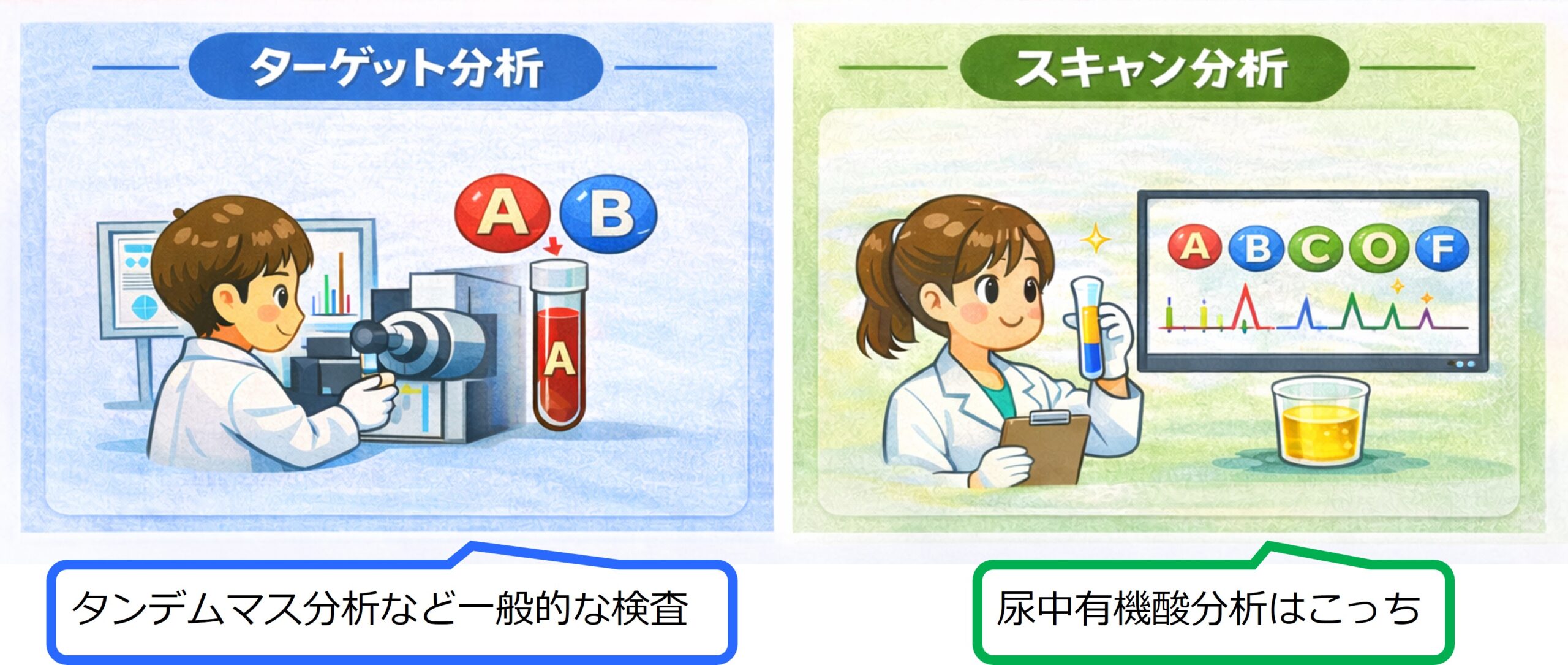 なお、タンデムマス分析が脂肪酸代謝異常症などの確認したい疾患に特徴的なアシルカルニチンやアミノ酸などの成分を狙った、いわゆる“ターゲット分析”を行っているのに対し、尿中有機酸分析は尿中に出てくる代謝産物を網羅的に測定する“スキャン分析”が特徴的です(イラスト2)。