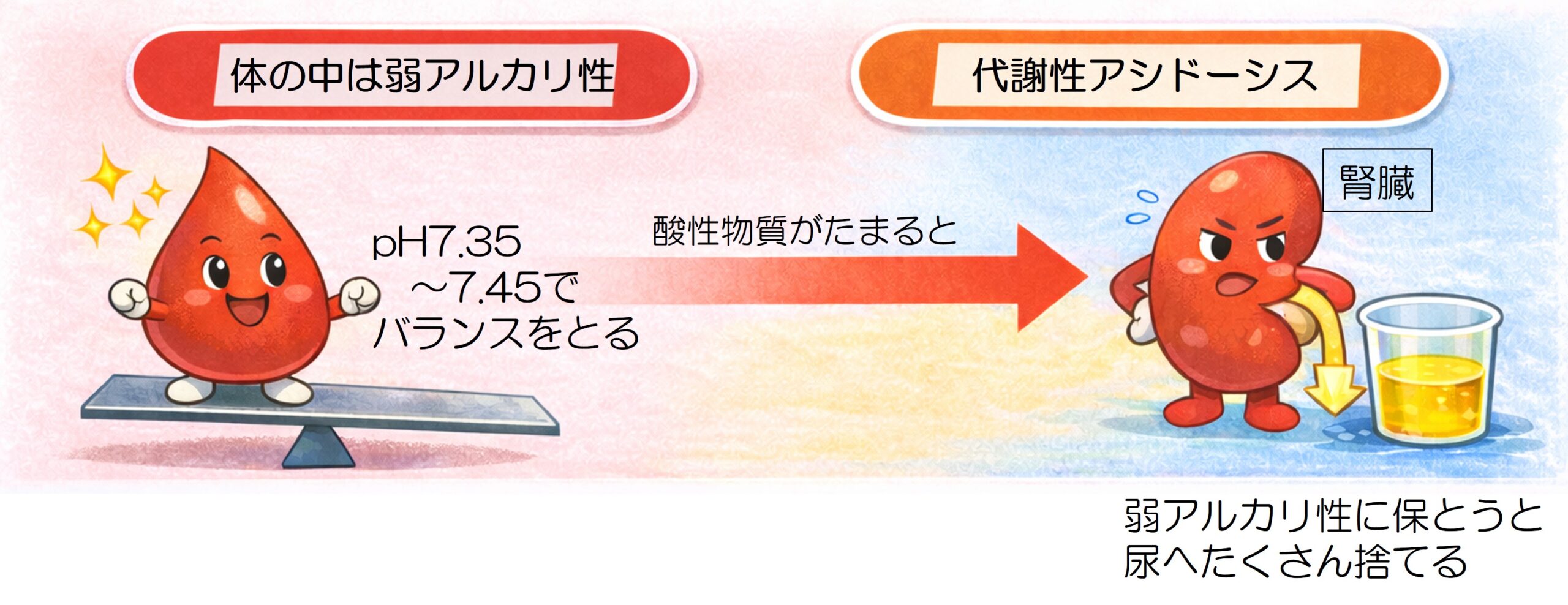 以前にもお伝えしましたが、私たちの血液はもともと弱アルカリ性(pH 7.35~7.45)に保たれています。とても微妙なバランスなので、病気によって有機酸などの酸性物質がたまると(=代謝性アシドーシス)、体は弱アルカリ性に保とうとして酸性物質を尿へせっせと出すので、有機酸代謝異常症の診断は尿を使うことが多いのです(イラスト1)。